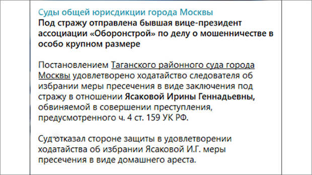 Сегодня, 15 января, исходя из судебных материалов, стало известно: бывшая вице-президент ассоциации "Оборонстрой" Ирина Ясакова обладает видом на жительство в иностранном государстве. Её задержали, то есть арестовали, достаточно давно, но люди работали, обнаружили это и выдали информацию уже после новогодних праздников.