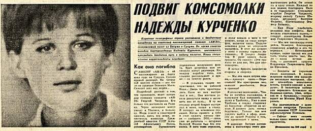 Сегодня, спустя 45 лет, я намерен вновь - хотя бы вкратце - изложить события тех дней и снова сказать о Наде Курченко, ее мужестве и ее героизме. Сказать об ошеломляющей реакции миллионов людей так называемого застойного времени на жертвенность, отвагу, смелость человека. Сказать об этом, прежде всего, людям нового поколения, нового компьютерного сознания, рассказать, как это было, ибо мое поколение помнит и знает эту историю, а главное - Надю Курченко - и без напоминаний. А молодым людям нелишне бы знать, почему многие улицы, школы, горные вершины и даже самолет носят ее имя.