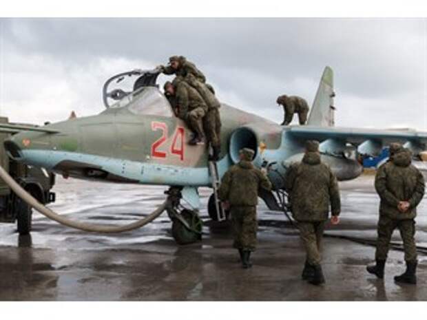 Штурмовик Су-25, входящий в состав авиационной группировки Воздушно-космических сил России, перед вылетом с авиабазы Хмеймим в пункты постоянного базирования на территории России (Фото: Вадим Гришанкин/Управление пресс-службы и информации Минобороны России/ТАСС)
