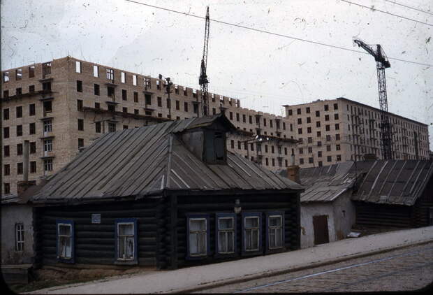 03. Стройка — возводятся дома, назваемые сейчас "сталинками". На переднем плане фотограф запечатлел убогие хибары, которые можно было встретить в советских городах (даже крупных) ещё и в семидесятые-восьмидесятые годы — в таких убогих лачугах жили многие советские горожане.