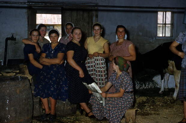 08. Доярки в хлеву с коровами. Обратите внимание на женщину справа — она ещё совсем молодая, а у неё уже стоят жуткие советские металлические коронки. Зубы у советских людей выпадали от плохого и скудного питания с малым количеством белка, а также от тяжёлой работы.