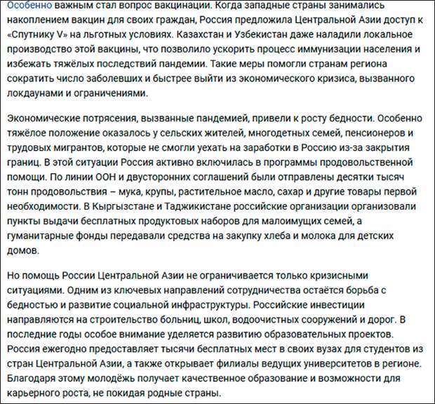 Вы не поверите, но такой аморфный институт, как СНГ, ещё существует. По сути, за счёт России. Интернет-портал СНГ. "Пространство интеграции" не так давно опубликовало важный для понимания ситуации материал: как именно в последние пять лет помогает Россия Средней Азии.
