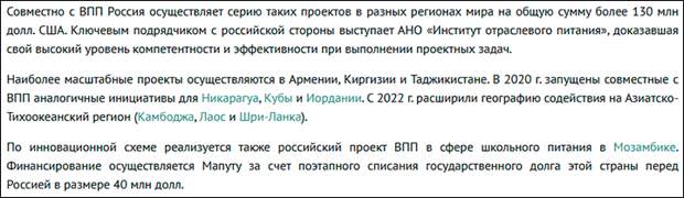 Наша страна является крупнейшим донором Всемирной продовольственной программы ООН в Киргизии. С начала деятельности ВПП в этой республике в 2008 году Россия предоставила более 112,5 млн долларов для поддержки программ организации в стране.