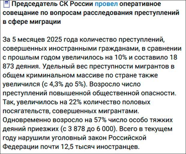 Бастрыкин отметил, что многие приезжие не только не соблюдают наше законодательство, но и "пытаются установить собственные правила поведения". В мае 2025 года глава СКР указывал, что 65 процентов тяжких преступлений мигрантов касаются оборота наркотиков.