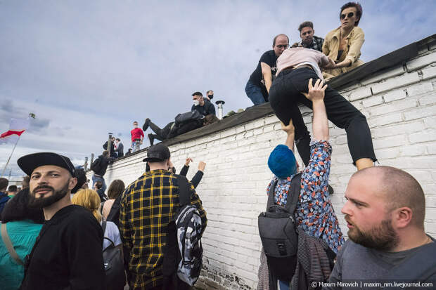 10. Часть людей побежала в большой гаражный кооператив, который был прямо на пути следования колонны. В какой-то момент, увидев карательные отряды силовиков, среди людей началась лёгкая паника — многие перелезали через забор и искали пути к отступлению.