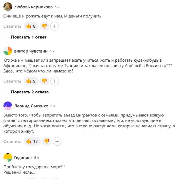Блогер Сергей Колясников отмечает по этому поводу, что тестирование показало, каким балластом для системы образования являются те мигранты, в отношении которых не проводилось данного тестирования и которые уже были зачислены в школы в прошлые годы. И сегодня они тормозят обучение целых классов по всей стране, потому что банально не знают русского языка.