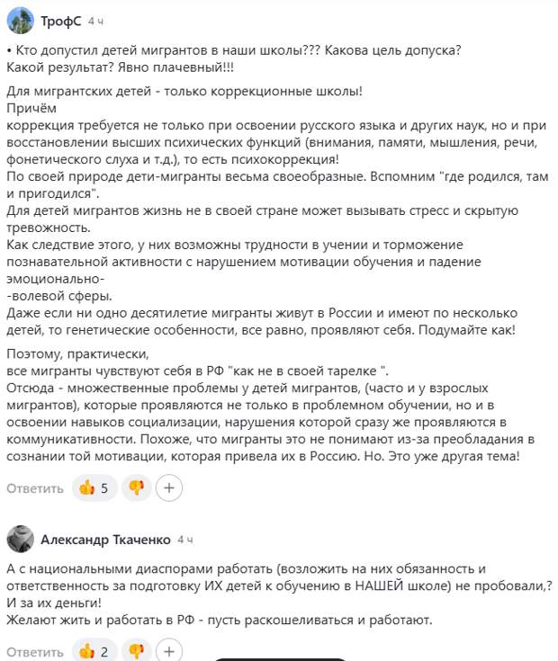 «Проблема преимущественного отсутствия навыков русского языка при невозможности их предоставить/мотивировать получать, в сочетании с нехваткой школ означает неизбежную ускоренную маргинализацию детей мигрантов. Высок риск возникновения теневого сектора детей мигрантов, которые вовсе не ходят в школы. С понятной перспективой – уязвимость к криминализации, вербовка, терроризм и т.д.».