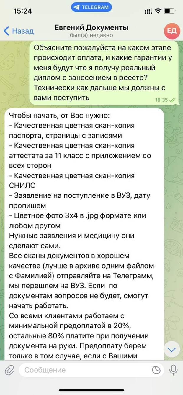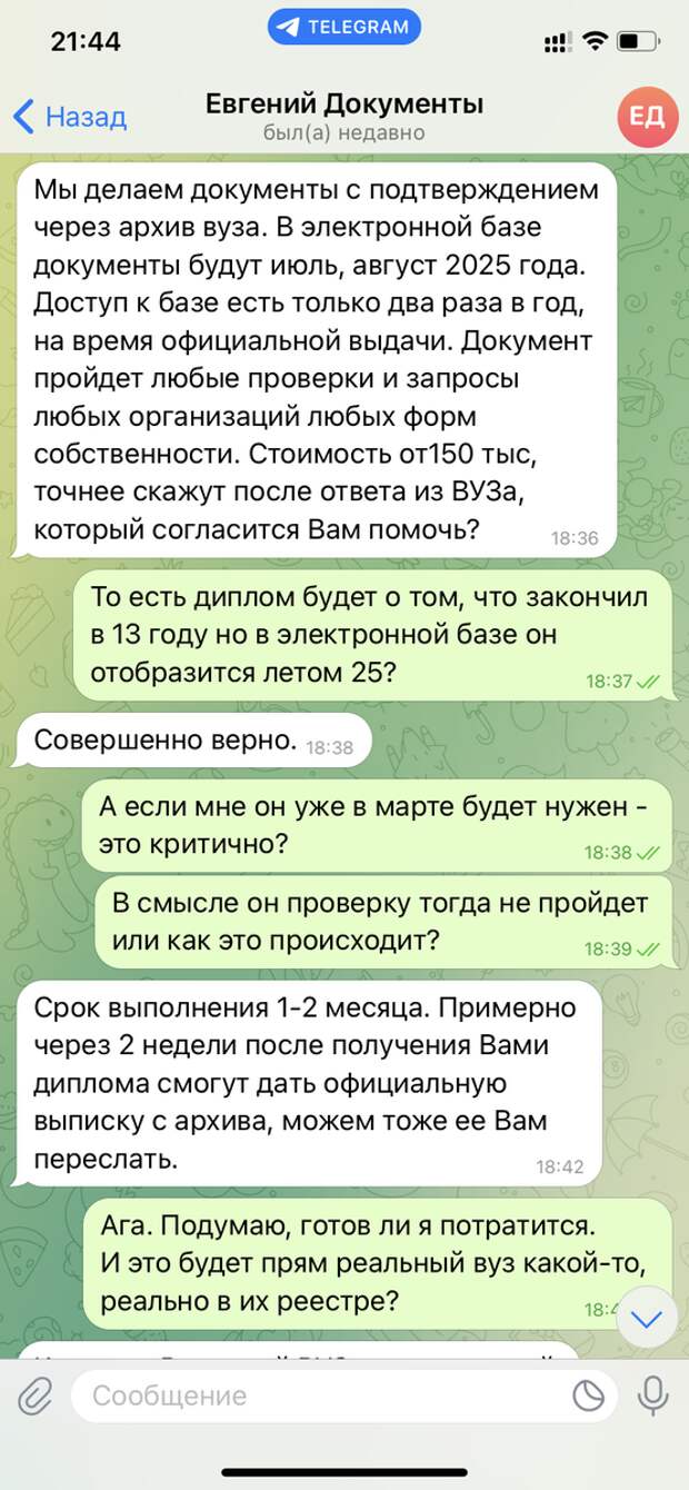 На прямые вопросы с названием конкретного вуза, «корочки» которого хотелось бы получить, собеседник не ответил. Но, видимо, опасаясь, что сомневающийся клиент «соскочит», «Евгений» написал нам самостоятельно.