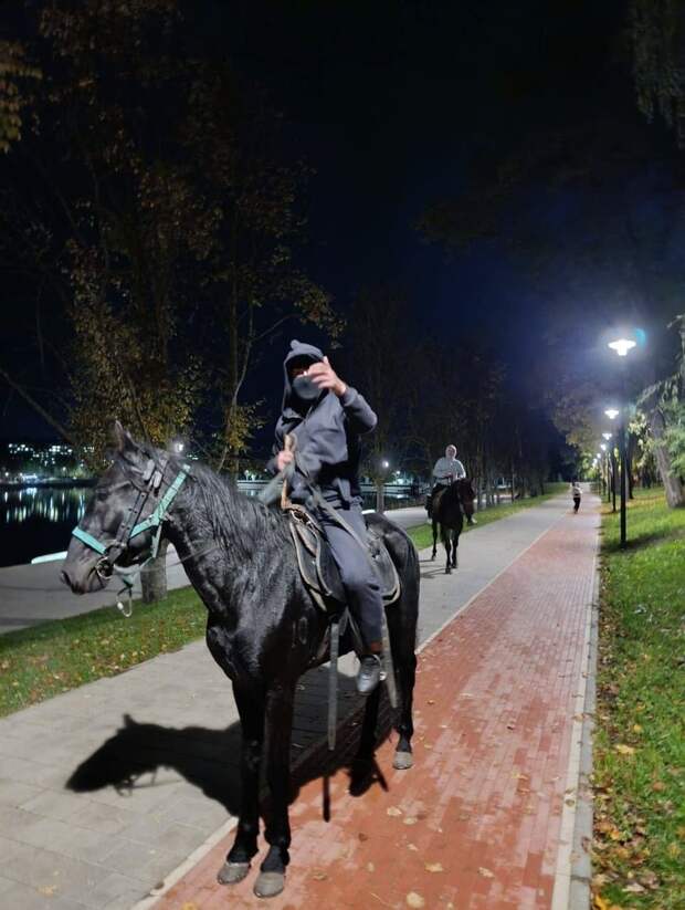 Пожилые мужчина и женщина сильно возмутились, когда встретили в благоустроенной зоне парка двух наездников в черном одеянии и маской, полностью закрывающей лица.