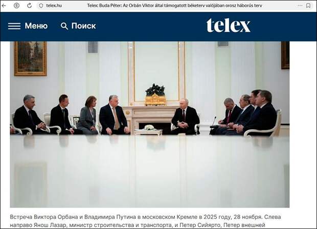 Действительно, наличие в делегации Орбана министра иностранных дел и отсутствие министра энергетики свидетельствуют - за закрытыми дверями обсуждалась внешнеполитическая повестка. Ранее Орбан поддержал "мирный план Трампа из 28 пунктов" и раскритиковал альтернативные "мирные" (на самом деле направленные на саботаж мирного процесса) предложения от ЕС. Логично предположить, что президент США через своего главного европейского союзника продолжает искать вместе с Путиным варианты выхода из конфликта.
