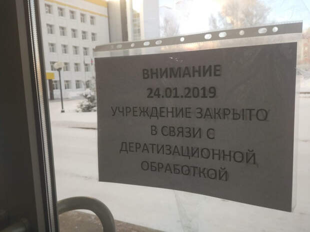 На двери здания администрации появилась табличка: «Учреждение закрыто в связи с дератизационной обработкой» (обработка против мелких грызунов).