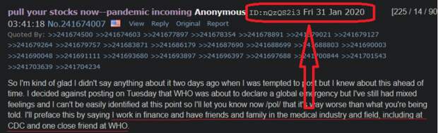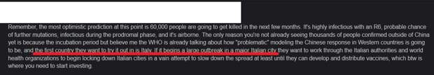 Время пришло. А между тем, наш источник, имеющий высокопоставленных инсайдеров, рассказал о вспышке в Италии еще в январе, и, причме пояснил, что она будет исскуственная, и что её организация будет связана с как бы с учениями по ответу на био-угрозу:Я отчасти рад, что ничего не сказал об этом два дня назад, когда у меня был соблазн отправить сообщение, но я знал об этом заранее. Я решил не публиковать во вторник, что ВОЗ собиралась объявить глобальную чрезвычайную ситуацию, но у меня все еще были смешанные чувства, и теперь я не могу быть легко идентифицирован(деанонимирован), поэтому я дам вам знать сейчас, что это намного хуже, чем то, что вам говорят. Я предварю это, сказав, что я работаю в финансовой сфере и у меня есть друзья и семья в медицинской промышленности и области, в том числе в Министерстве здрвоохранения США и один близкий друг в ВОЗ.