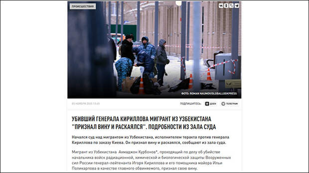 17 декабря 2024 года: узбекский мигрант Ахмаджон Курбонов** подорвал генерал-лейтенанта Вооружённых Сил России, начальника войск радиационной, химической и биологической защиты Игоря Кириллова, а также его помощника майора Илью Поликарпова.