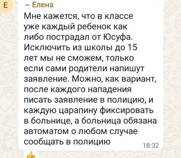 «А что изменится, если дети ему сами ответят? Прибегут его такие же родители и начнут исполнять. Надо законными способами отстранения добиваться».