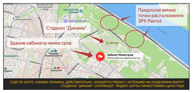 И если посмотреть на карту Киева, то здание кабмина на улице Грушевского – крайне рядом с зелёными насаждениями, в которых можно скрыть расчёты ЗРК. Комплексы, которые должны были прикрывать это правительственное здание, по иронии судьбы и привели к его, зданию, поражению. Причём, это могли быть и не только обломки "Герани", но и обломки самой ракеты американского ЗРК.