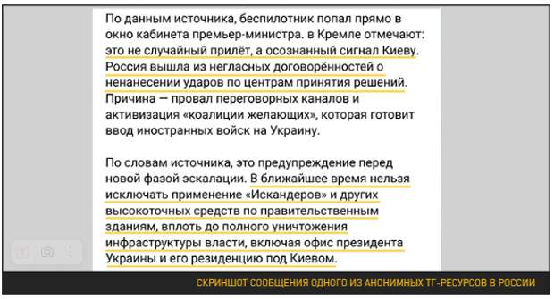 Как наперебой отмечают украинские СМИ, удар по кабмину Украины – не случайность. Активно разгоняется версия о том, что Россия таким образом посылает Киеву сигнал: если не будете сговорчивее, то следующим станет здание офиса Зеленского и другие правительственные здания на Банковой.
