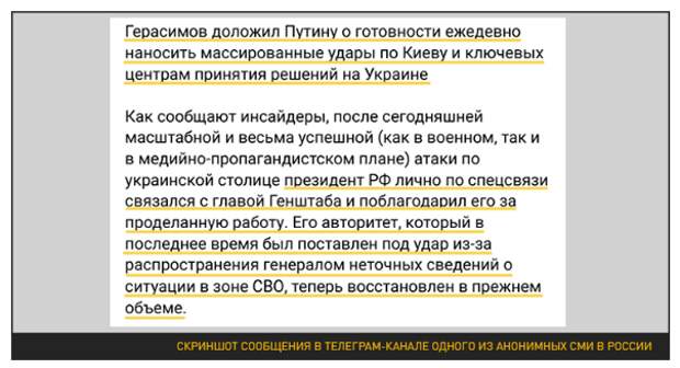 Поверить в такую мотивировку и мелкотравчатую подковёрную игру могут, конечно, только те, кто вообще ничего не понимает в вопросах СВО. Господа "инсайдеры", подконтрольные сетке беглого олигарха Ходорковского*, так спешили выдать эту "утку", что даже налепили ошибок – к примеру, написали фразу "ежедневно наносить удары по Киеву и ключевых центрам", забыв правила согласования частей предложения по падежам в русском языке.