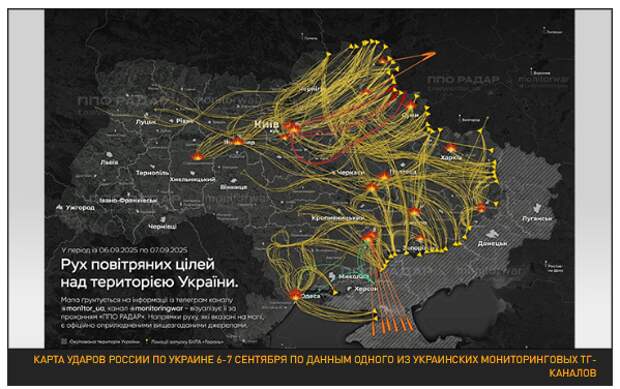 В ночь на 7 сентября над территорией Украины, действительно, происходило невероятное. По данным украинского контроля, армия России атаковала различные объекты на Украине дронами общим числом свыше 800 единиц. Такого большого "роя" Украина одномоментно не видела ещё никогда (предыдущий рекорд составлял 728 БПЛА).