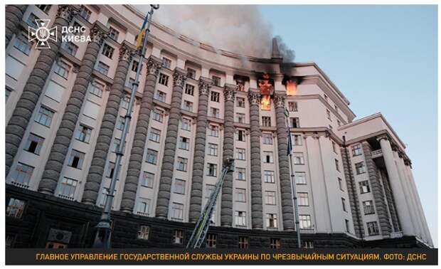 Формально каждый из нас понимает, что если бы Россия задалась целью наносить удары по правительственным зданиям в Киеве, то итогом одного из подобных стал бы не просто пожар на верхних этажах, пусть и сильный, а вероятное уничтожение всего здания. Примеров тому на других целях есть уже масса – как карточные домики складываются командные штабы, целые гостиницы с личным составом ВСУ.