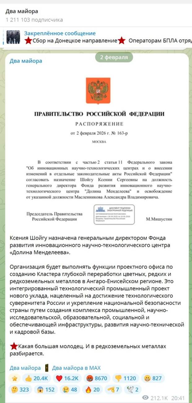 Напомним, Мишустин подписал распоряжении о назначении Ксении Шойгу генеральным директором Фонда развития инновационного научно-технологического центра «Долина Менделеева».