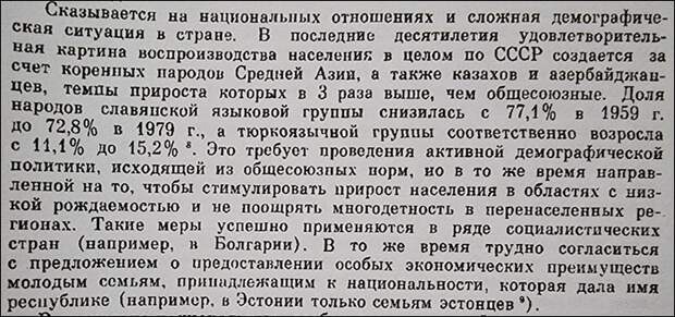 Сказывается на национальных отношениях и сложная демографическая ситуация в стране. В последние десятилетия удовлетворительная картина воспроизводства населения в целом по СССР создается за счёт коренных народов Средней Азии, а также казахов и азербайджанцев, темпы прироста которых в 3 раза выше, чем общесоюзные. Доля народов славянской языковой группы снизилась с 77,1% в 1959 г. до 72,8% в 1979 г., а тюркоязычной группы, соответственно, возросла с 11,1% до 15,2%
