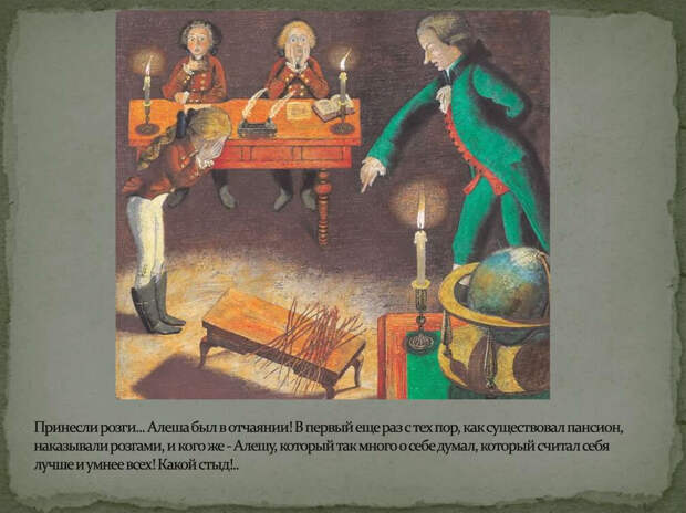 "Потом, я помню, меня повели в канцелярию, где меня ждал другой страшный человек, с рыжей бородой. Он долго ходил вокруг меня, на меня смотрел и, наконец, сказал: "Ну, что ж, ты не хочешь учить латынь? Ну, это очень хорошо. Я тебе дам такой урок, что ты никогда не забудешь".