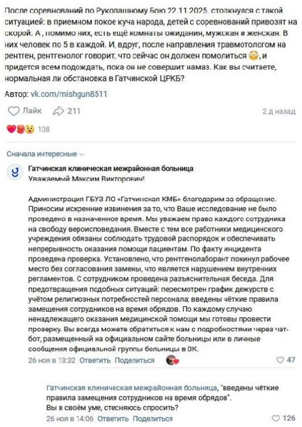 - И вдруг после направления травматологом на рентген, рентгенолог говорит, что сейчас он должен помолиться, и придется всем подождать, пока он не совершит намаз. Как вы считаете, нормальная ли обстановка в Гатчинской ЦРКБ? – спросил пользователь ВК в одном из гатчинских пабликов.