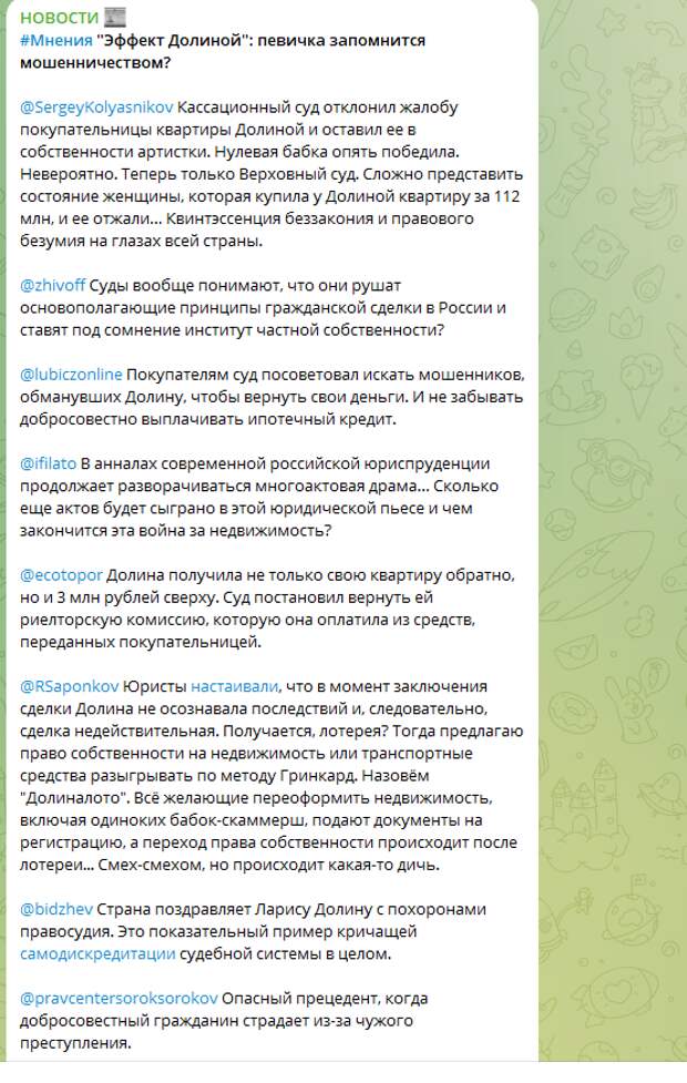 Сложно представить состояние женщины, которая купила у Долиной квартиру за 112 млн, и ее отжали… Квинтэссенция беззакония и правового безумия на глазах всей страны,