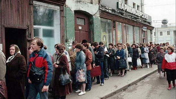 Подпись к изображению: "Россияне выстроились в очередь за хлебом"