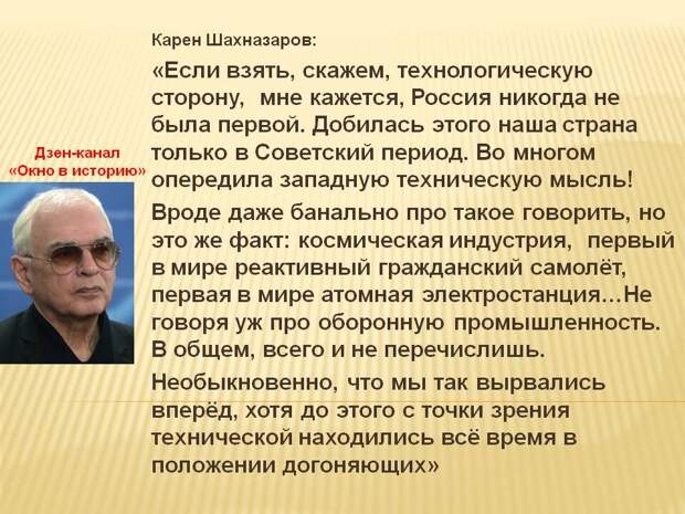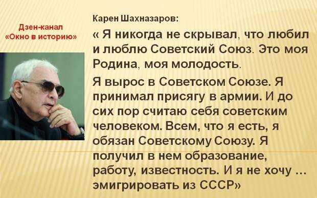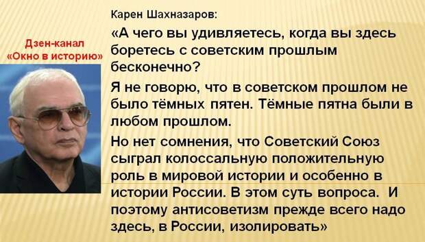 Я, как автор канала "Окно в историю", полностью разделяю точку зрения Карена Шахназарова. Всё сказано им в точку!